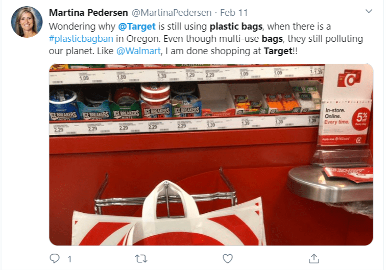 As a result, petitions have been created with nearly 500,000 signatures requesting Target remove all plastic bags (Change.org, 2019). Surprisingly, Target has done little to show concern for this issue. Scrolling through Target’s twitter feed, the vast majority of entries revolve around sales on their own merchandise. Instead of taking the issue head on, Target has chosen to act as if the problem doesn’t exist. While this may mitigate the issue by trying to downsize its relevance, many potential customers will turn their backs to Target in return.
